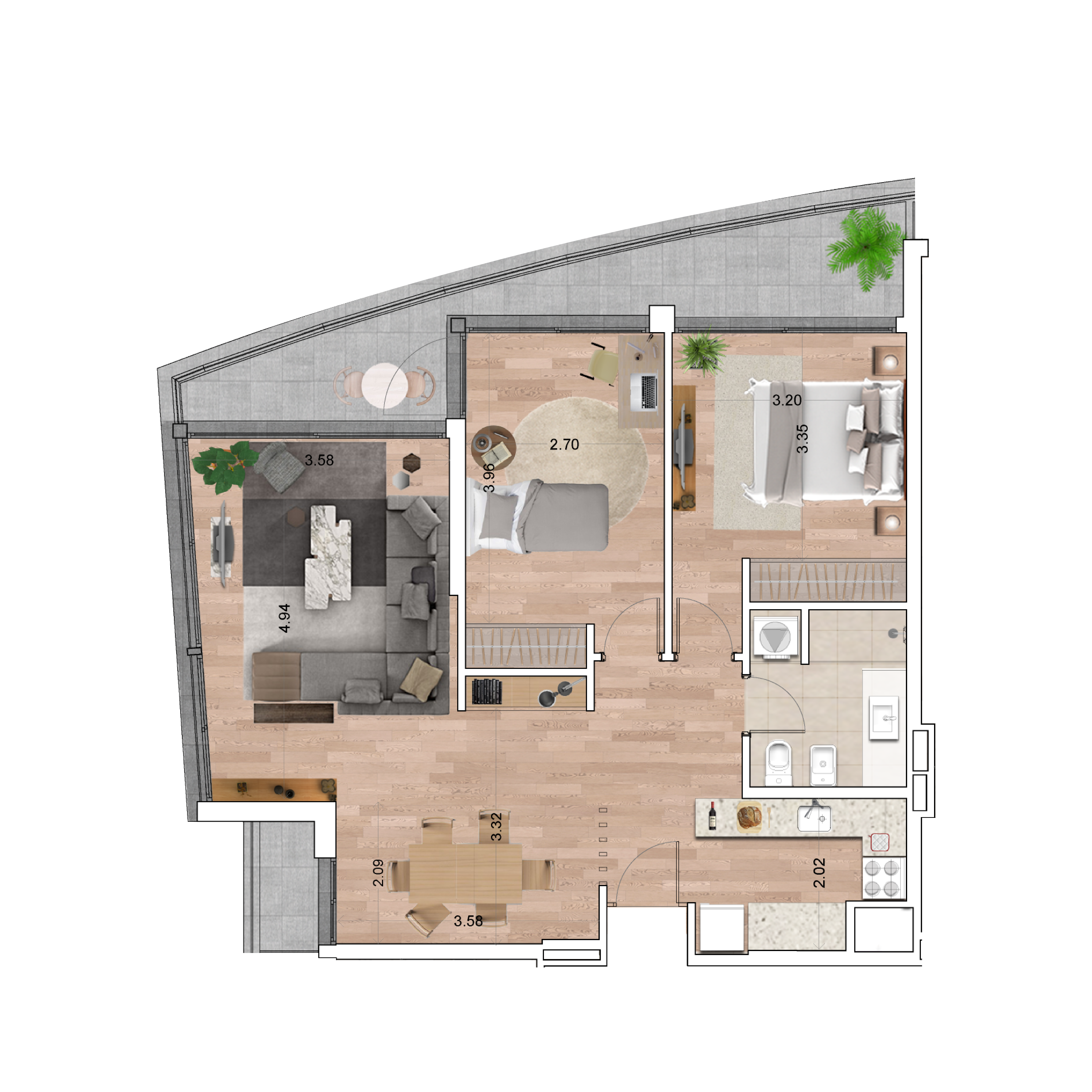 El área privada incluye el 100% de los espacios interiores, muros exteriores, muros interiores, y muros separativos de áreas comunes, el 50% de muros separativos entre unidades y el 100% de ductos internos de la unidad.Se incluyen también los metrajes de las terrazas principales, y de servicio. El área privada no corresponde el área según plano de mensura. Las áreas comunes corresponden al porcentaje de palier en relación proporcional al área privada de cada apartamento que accede por el mismo.Las dimensiones y contenidos corresponden al permiso municipal y están sujetas a posibles variaciones. La empresa podrá realizar variaciones sin notificación previa de orden estético, funcional o reglamentario, tanto de espacios comunes o propios, siempre dentro de los estipulado por las normativas vigentes. El equipamiento es indicativo y se representa en los gráficos solo a título informativo.